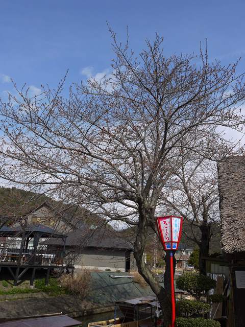 本日、乗り場のお迎え桜と水郷の桜並木に雪洞を設置しました。